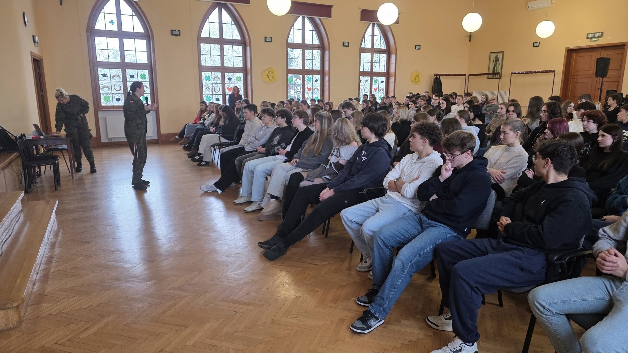 Dziś, 26 listopada, naszą szkołę odwiedziły ppor. Krystyna Brylska oraz szer. Agnieszka Daukszewicz z WCR Głogów Pani podporucznik Brylska poprowadziła ciekawą prezentację pt. „Zawód: Żołnierz”, podczas której uczniowie mogli dowiedzieć się, jak wygląda codzienna służba wojskowa, jakie są ścieżki kariery w armii oraz jakie wartości towarzyszą żołnierzom w ich pracy. W spotkaniu wzięły udział klasy: 4ag, 4d, 3au, 3d, 3b oraz 2ag.Dziękujemy naszym gościom za inspirujące wystąpienie i poświęcony czas – być może dzisiejsze spotkanie stanie się dla kogoś początkiem drogi w mundurze! ![]()