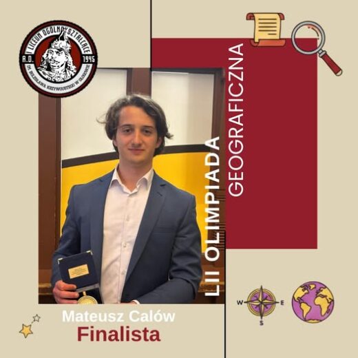 Uczeń naszej szkoły Mateusz Calów z klasy 4au odniósł kolejny znaczący sukces edukacyjny, zdobywając tytuł finalisty LII Olimpiady Geograficznej. Jest to już drugie tak prestiżowe osiągnięcie w jego dorobku, co świadczy o jego systematycznej pracy, szerokiej wiedzy oraz wyjątkowych umiejętnościach analitycznych.Uzyskanie tytułu finalisty Olimpiady Geograficznej wymaga nie tylko doskonałej znajomości zagadnień z zakresu geografii fizycznej i społeczno-ekonomicznej, ale także umiejętności interpretacji danych oraz rozwiązywania złożonych problemów. Serdecznie gratulujemy