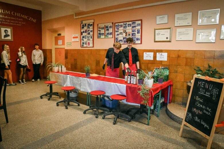 Szczególną rolę odegrała młodzież naszego LO, która w eleganckich, bordowych biretach oprowadzała gości po salach lekcyjnych. Tam czekały przygotowane stanowiska związane z różnymi przedmiotami, m.in.: